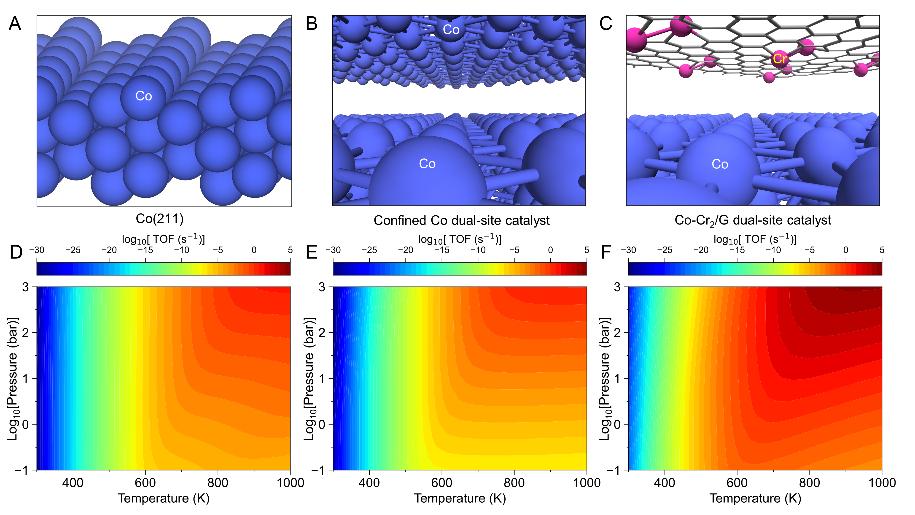 Figure 3 Schematic structures of stepped Co(211) surface (A), confined Co dual-site catalyst (B), and Co-Cr2/G dual-site catalyst (C). The calculated TOF of CH4 as a function of temperature and total pressure (pCO:pH2 = 1:2) on the Co(211) surface (D), the Co dual-site catalyst (E), and the Co-Cr2/G dual-site catalyst (F), respectively.