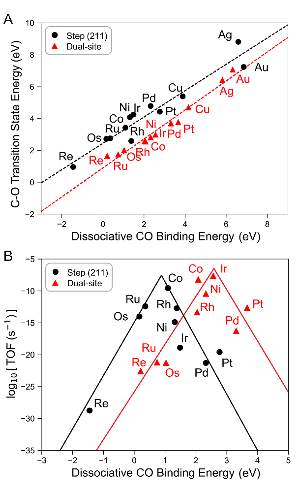 Figure 2 CO dissociation energy barrier on metal catalysts (A) and the relationship between TOFCH4 and dissociative CO binding energy at 523 K / 3 bar (B).