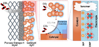 Our primary research systems cover fundamental scientific challenges in electrocatalytic CO₂ reduction (CO₂RR), hydrogen evolution (HER), oxygen evolution (OER), as well as anion exchange membranes and water electrolysis technologies (AEM & AEM-WE). Research directions include: