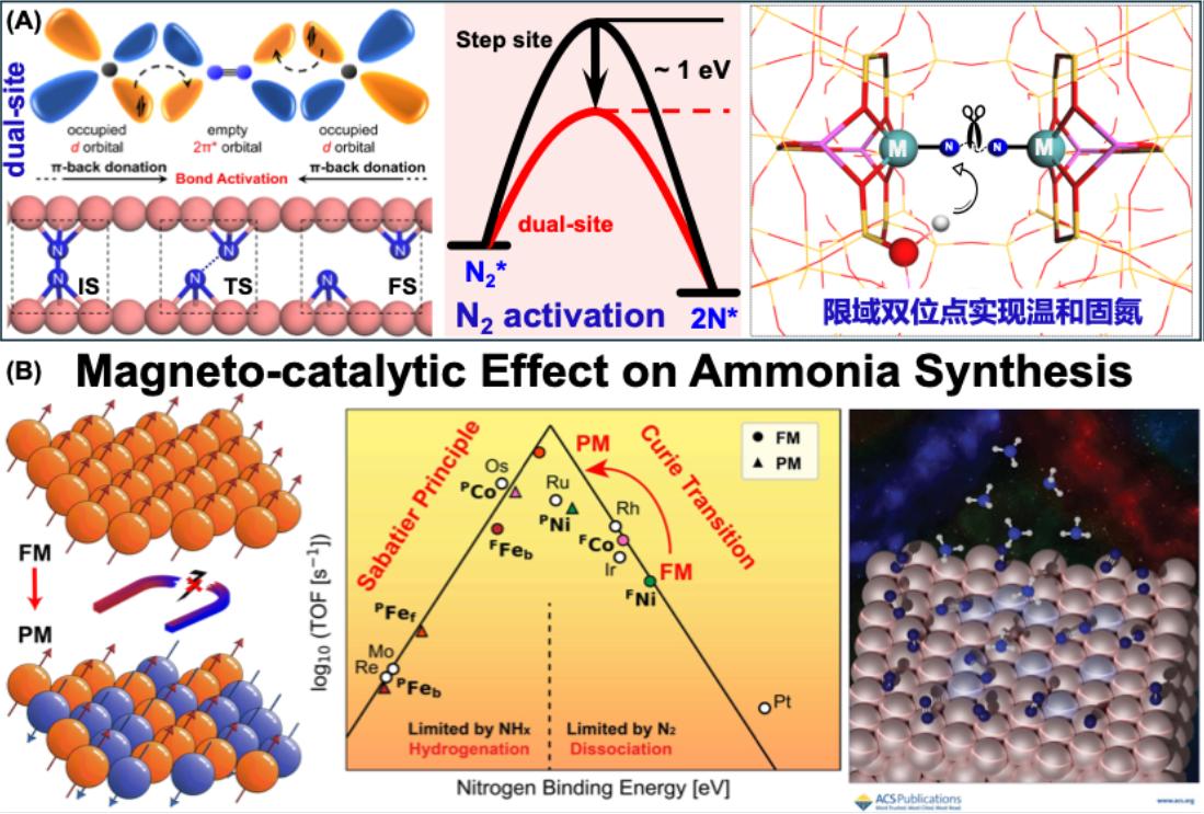 氨(NH3)是农业和工业中不可或缺的基础化学品,但传统的Haber–Bosch工艺需在高温、高压条件下打断惰性的N≡N三键,导致能耗高。因此,在温和条件下实现高效氮气转化合成氨是当前学术界与工业界的共同目标,但仍然面临巨大的挑战。围绕温和固氮中的关键科学问题,我们以惰性N≡N三键的高效活化为核心目标,从催化新机理的理论探索出发,提出了限域双位点氮气活化的策略,并通过构建一系列模型催化剂实现了氮气的低能垒活化(图3A)。具体而言,利用分子筛等多孔材料作为载体,通过构筑活性位点明确、结构稳定的双位点催化剂,系统研究空间结构、金属活性中心种类及反应物种吸附态对固氮机理、催化活性与选择性的影响机制,最终为实现温和条件下的高效氨合成提供重要的理论参考。