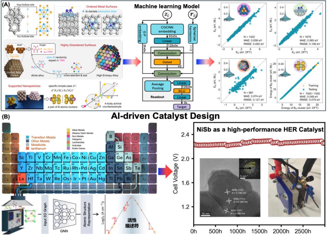 随着理论模拟方法和人工智能技术的发展,理论驱动的催化剂智能设计范式逐渐成为可能,并有望替代传统的“试错式”催化剂设计策略。目前,我们已经在高通量计算和机器学习驱动的催化剂智能设计方面积累了丰富的经验。其中,近期开发的具备解析不同复杂催化体系中化学图像相似性能力的等变图神经网络(equivGNN)模型,实现了多类关键催化描述符的精准预测(图2A)。基于相应的机器学习方法和我们构建的稳定性-活性-价格筛选框架精准的预测出具有双六方密堆积(DHCP)晶型的NiSb合金为最佳的HER催化剂(图2B),并最终在实验室成功的合成和应用于电解槽中,连续稳定运行超过3000小时,其稳定性和活性都是目前非贵HER催化剂的最高水平。课题组将继续致力于推进人工智能在AEM-WE and beyond催化剂设计中的应用,加速相关催化剂的研发。
