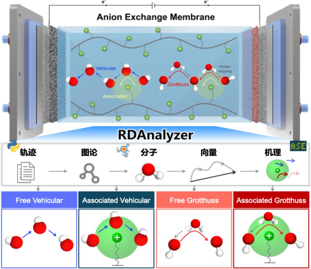 阴离子交换膜是AEM-WE技术的关键部件之一。然而,目前尚缺乏能够满足产业化要求的高性能阴离子交换膜,这已成为制约AEM-WE技术发展的瓶颈之一。因此,开发高稳定性、高电导率和高机械强度的阴离子交换膜是实现AEM-WE技术产业化应用的核心课题。目前,实验室已经通过自主开发动力学轨迹分析工具(RDAnalyzer),成功实现了阴离子交换膜中复杂氢氧根传输机理的解耦与分析,为高性能AEM的理性设计奠定了坚实的理论和工具基础(如图1)。我们将通过发展高精度的多尺度理论模拟方法和人工智能技术进一步加速高性能AEM的研发。