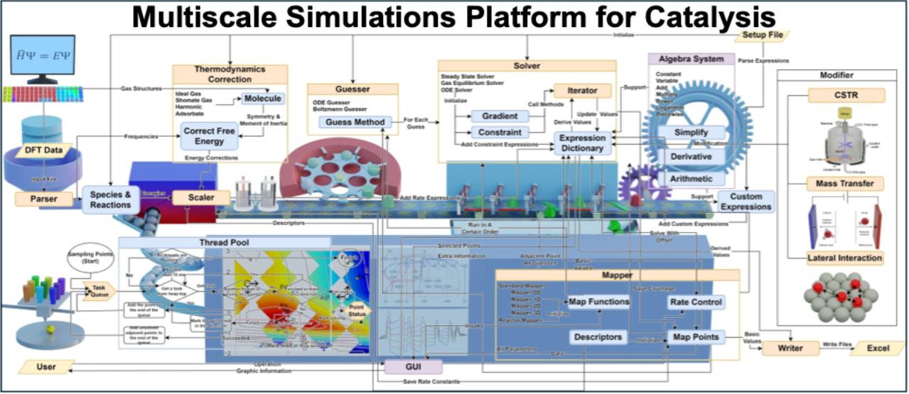 由于AEM-WE是一个耦合了多组件和多场的复杂集成系统,因此为了能够更加全面的模拟其中跨尺度多因素对于催化性能的影响,课题组开发了一套计算效率高且通用性强的多尺度动力学模拟程序(图4)。目前已经成功应用于揭示催化表界面微环境和传质等跨尺度因素对于电催化学性能的影响机制,为电催化体系的理论研究提供关键技术支撑。
