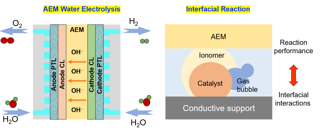 阴离子交换膜水电解技术采用致密阴离子交换膜作为隔膜,在阴阳极间构建碱性界面环境,兼具碱性水电解槽的非贵金属催化剂优势与质子交换膜技术的高效气液分离特性。我们通过理性结构设计,开发具有自主知识产权的阴离子交换膜材料,重点攻克离子传导率低、运行稳定性不足与多相界面优化等关键科学问题。